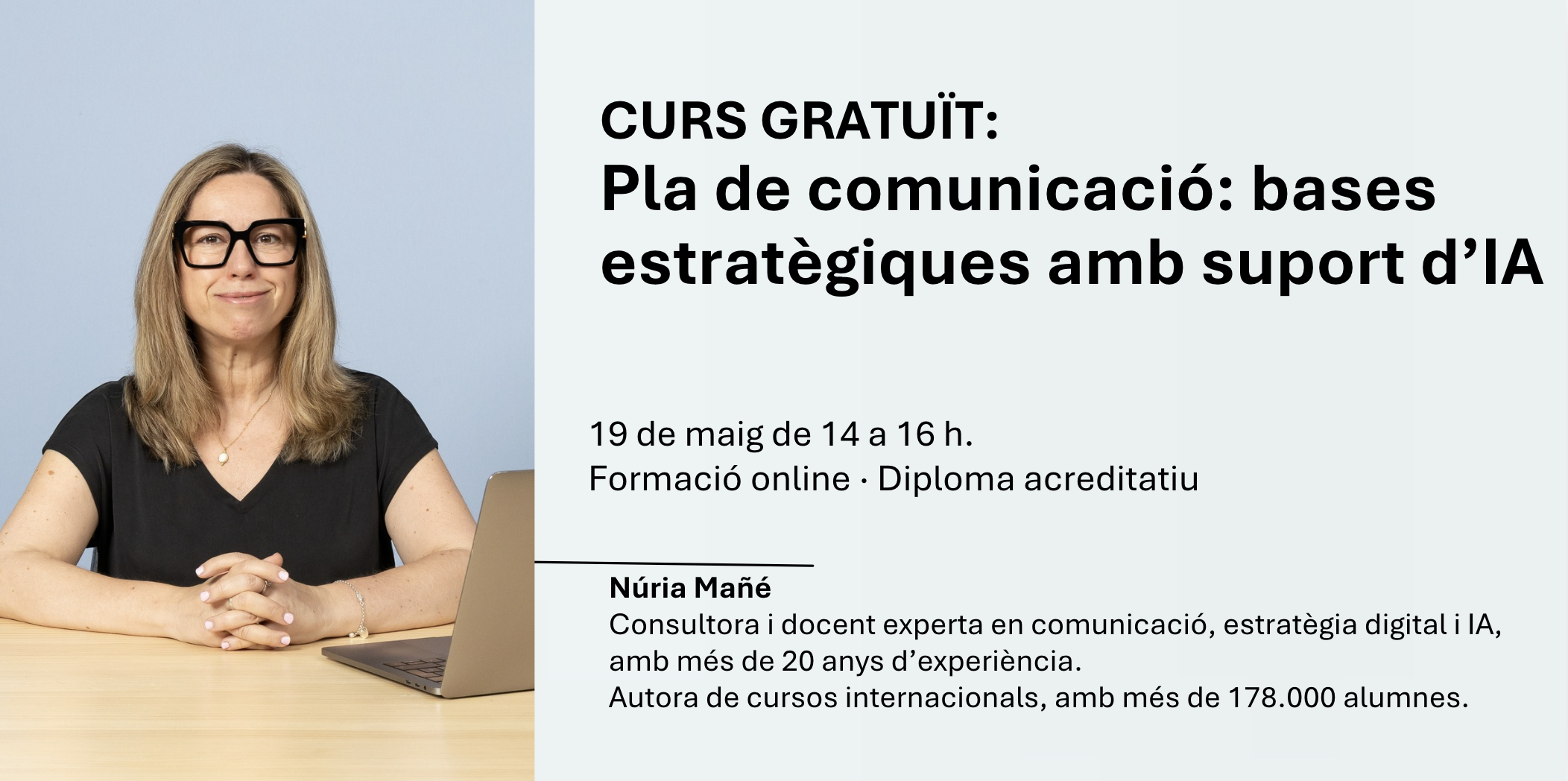Núria Mañé, consultora, docent i conferenciant especialitzada en comunicació, estratègia digital i intel·ligència artificial aplicada. Amb més de vint anys d’experiència, acompanya empreses, institucions i professionals en la definició d’estratègies que combinen innovació tecnològica, creativitat i visió humana. Col·labora amb universitats i escoles de negoci i és autora de cursos internacionals sobre comunicació i IA, amb més de 180.000 alumnes.